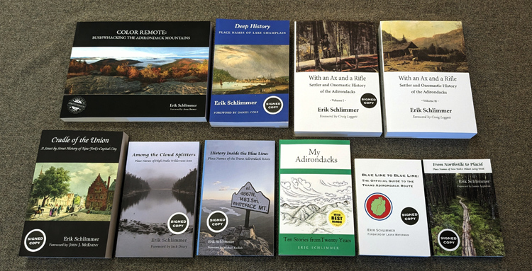 Our unique, limited print run titles include Blue Line to Blue Line (2013, only Trans Adirondack Route guidebook), History Inside the Blue Line (2014, only Trans Adirondack Route place name book), My Adirondacks (2015, voted Best Memoir by Adirondack Center for Writing), Among the Cloud Splitters (2016, only High Peaks place name book), Cradle of the Union (2019, only Albany street name history book), Color Remote (2019, most expansive Adirondack coffee table photo book), From Northville to Placid (2021, only Northville Placid Trail place name book), With an Ax and a Rifle (2023, most thorough Adirondack settlement book) Deep History (2023, only Lake Champlain place name book), and Wicked Awesome Adirondack Chronology (2024, only Adirondack chronology book).